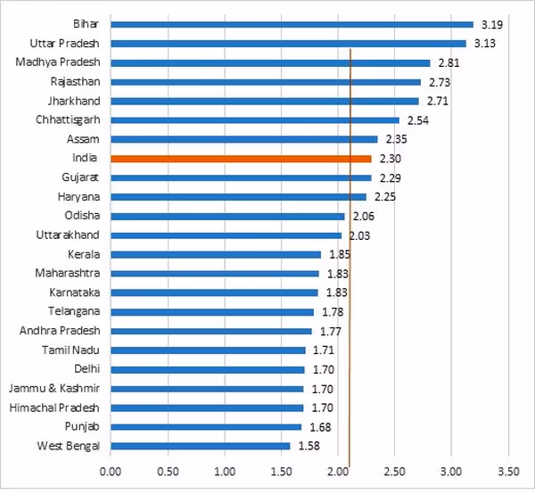Looking at the demographic future of the country as whole hides the enormous differences across states. Some states like West Bengal (TFR of 1.6 in 2014) and Tamil Nadu (1.7) have TFR close to many European countries, whereas some others like Bihar (3.2) and Uttar Pradesh (UP) (3.1) have equivalents in sub-Saharan Africa.