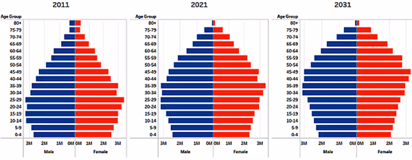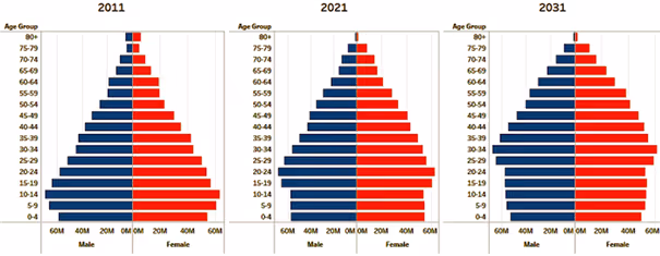 To assess the impact of the demographic bulge on demand for higher education in India, I project population1 and age structure at national and state levels using data from Census 2011 and Sample Registration Survey (SRS) 2014-2015, along with models of fertility decline in states (Retnakumar 2009). Based on these projections, the population pyramids shown below represent the change in age structure in India during 2011-2031. During 2021-2031, the demographic peak will shift to 15-24 years, the crucial cohort to be educated and skilled to prepare for the economy.