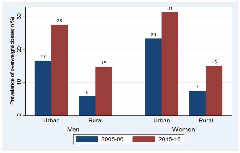 Atleast one in three adults is overweight or obese in several parts of India (National Family Health Survey (NFHS)-4, 2016), and this has become a major health issue. Growing evidence suggests that prevelance of overweight and obesity in India are no longer urban phenomena, and in some states, the prevalence is comparable to developed countries (Siddiqui and Donato 2020, Aiyar et al. 2021). However, this issue has not received adequate attention from policymakers. In the context of the Covid-19 pandemic and the role played by co-morbidities in elevated mortality rates, it is important to examine the link between obesity and Covid-19.