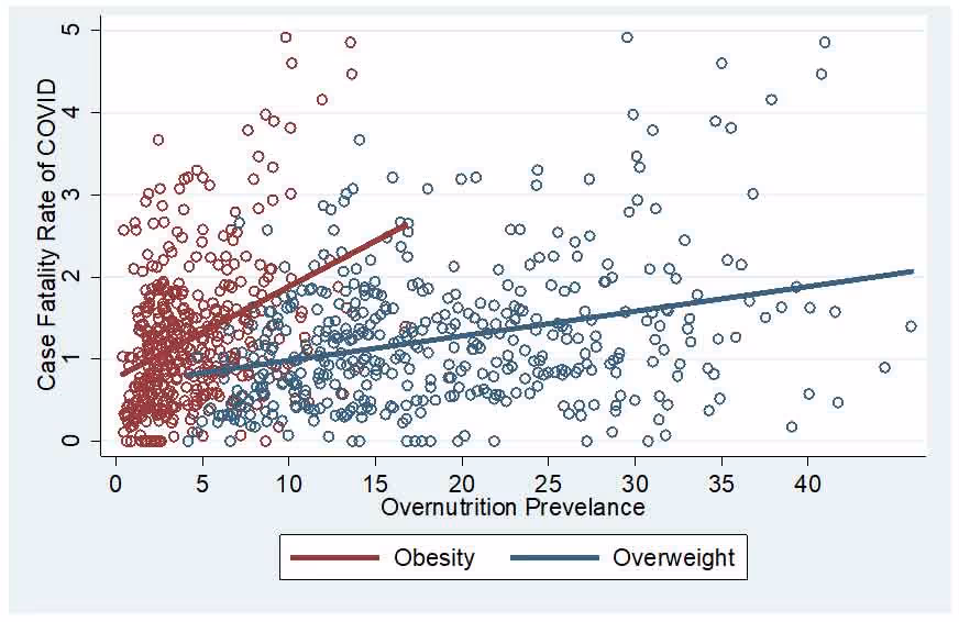 Our empirical analysis shows that the correlation between overnutrition and Covid-19 prevalence is positive and significant (Figure 2). Moreover, if we use obesity as an indicator of overnutrition, the relationship becomes stronger. Next, we demonstrate that a positive and significant relationship exists between CFR of Covid-19 in a district and the proportion of overweight and obese individuals (Figure 3). Unsurprisingly, the magnitude of the correlation is stronger where the prevalence of obese individuals is higher.