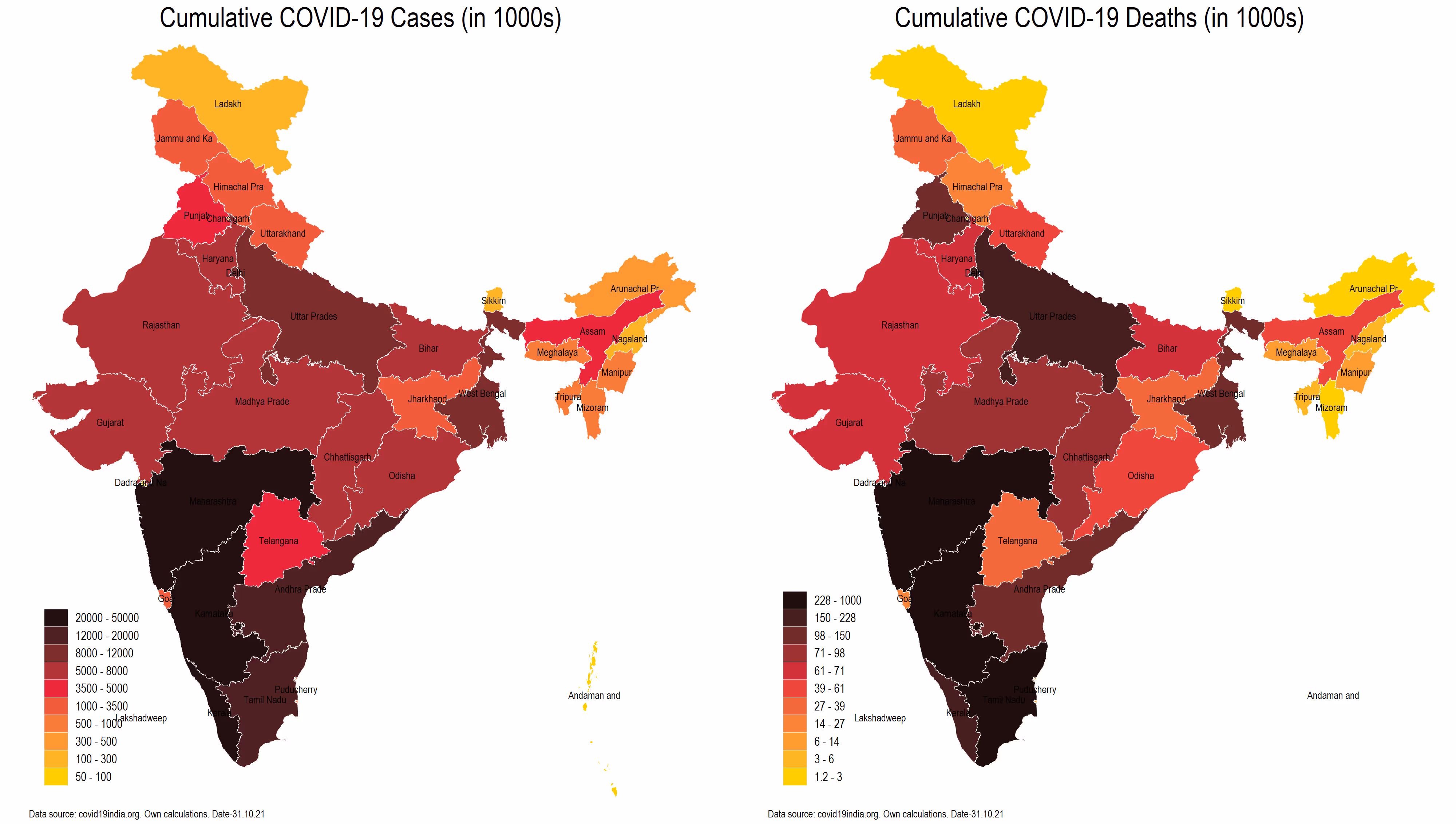 Figure 6. Covid-19 vaccinations in India (till October 2021), by state, in absolute (left panel) and proportional (right panel) terms