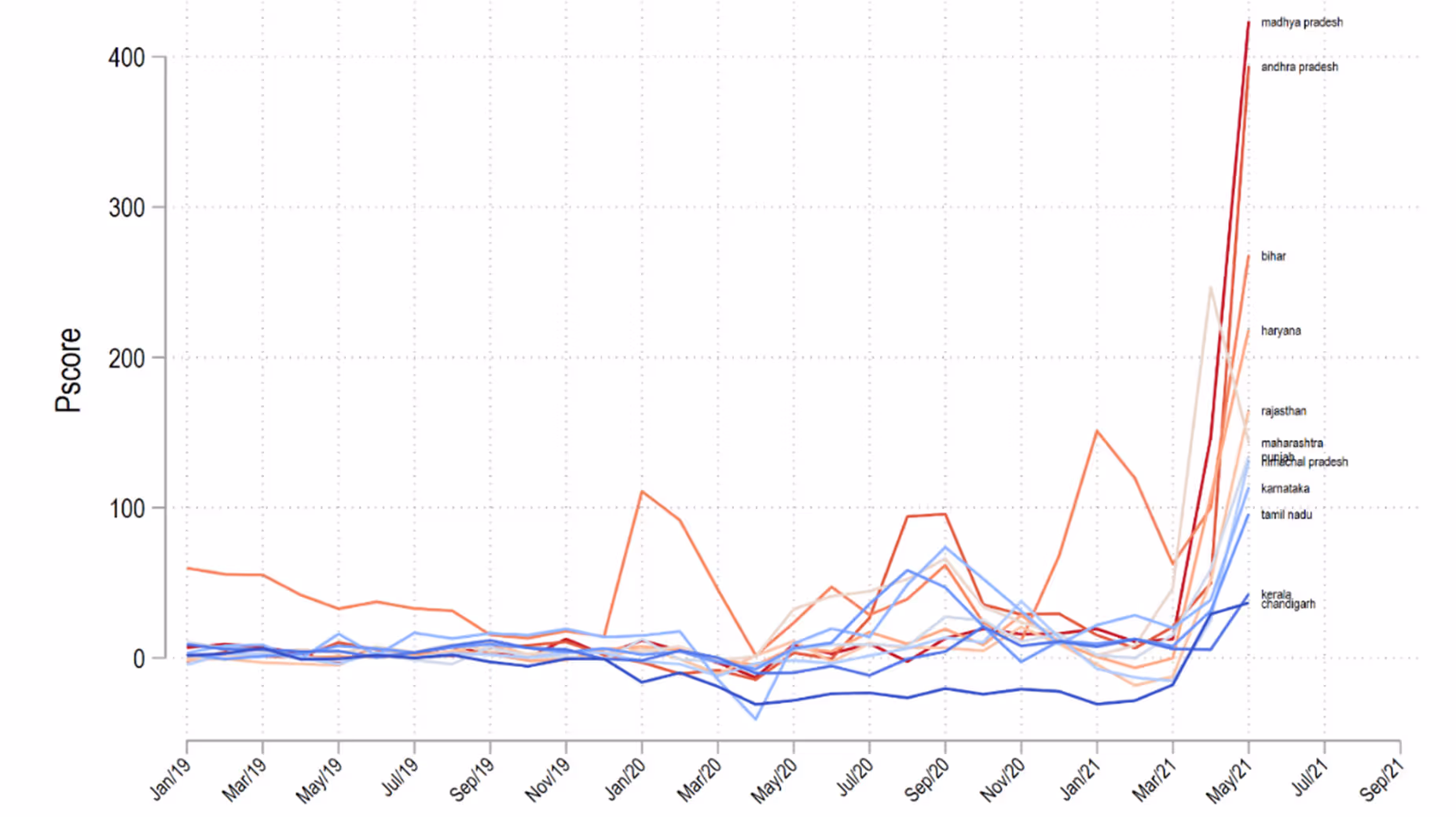 उदाहरण के लिए, यदि हम चित्र 4 देखें, तो मई 2021 के महीने में आंध्र प्रदेश का पी-स्कोर 400% था, जिसका अर्थ है कि बेसलाइन अवधि की तुलना में अधिक मृत्यु दर उस महीने की अनुमानित मृत्यु संख्या का चार गुना थी (2015-2019 का औसत)। सरल शब्दों में कहा जाये तो, इस तरह की अधिक मृत्यु संख्या आधिकारिक आंकड़ों में कोविड-19 मौतों की महत्वपूर्ण कमी और राज्यों में अधिक मौतों में अंतर की ओर इशारा करती है।
