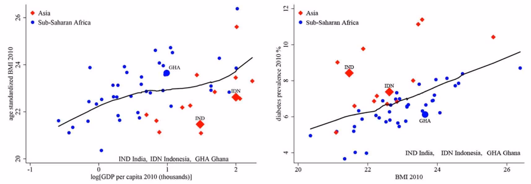 मॉडल के अनुमानों का परीक्षण करने और उस पर आधारित जैविक संबंधों की पुष्टि करने के बाद, हम माइक्रो-डेटा से देशों के बीच की तुलनाओं की ओर बढ़ते हैं। डीटन (2007) का मानना है कि ऊंचाई के आधार पर मापी जाने वाली वयस्क के पोषण की स्थिति दक्षिण एशिया में प्रति व्यक्ति जीडीपी (सकल घरेलू उत्पाद) से अनुमानित की तुलना में कम है, जबकि अफ्रीका के सन्दर्भ में यह विपरीत है। पोषण की स्थिति को मापने के लिए ऊंचाई के बजाय बीएमआई का उपयोग करते हुए हम चित्र 4 (बाएं पैनल) में समान क्षेत्रों के बीच के पैटर्न को दर्ज करते हैं। इसके अलावा, मौजूदा शोध से पता चला है कि औसत बीएमआई कम होने के बावजूद दक्षिण एशियाई लोगों में मधुमेह और संबंधित चयापचय संबंधी विकारों का असामान्य रूप से उच्च फैलाव है, (नारायण 2017)। हम चित्र 4 (दाएं पैनल) में देखते हैं कि बीएमआई के आधार पर मधुमेह की व्यापकता, वास्तव में अफ्रीका की तुलना में न केवल दक्षिण एशिया में बल्कि एशिया में अधिक है। जब हम क्षेत्रों के बीच आय की गतिशीलता का ध्यान रखते हैं, तो हमारा मॉडल इन असंबंधित निष्कर्षों की व्याख्या कर सकता है, अर्थात, एशिया में वर्तमान आय अधिक है, लेकिन ऐतिहासिक आय, जो सेट पॉइंट को निर्धारित करती है, अफ्रीका में अधिक थी।
