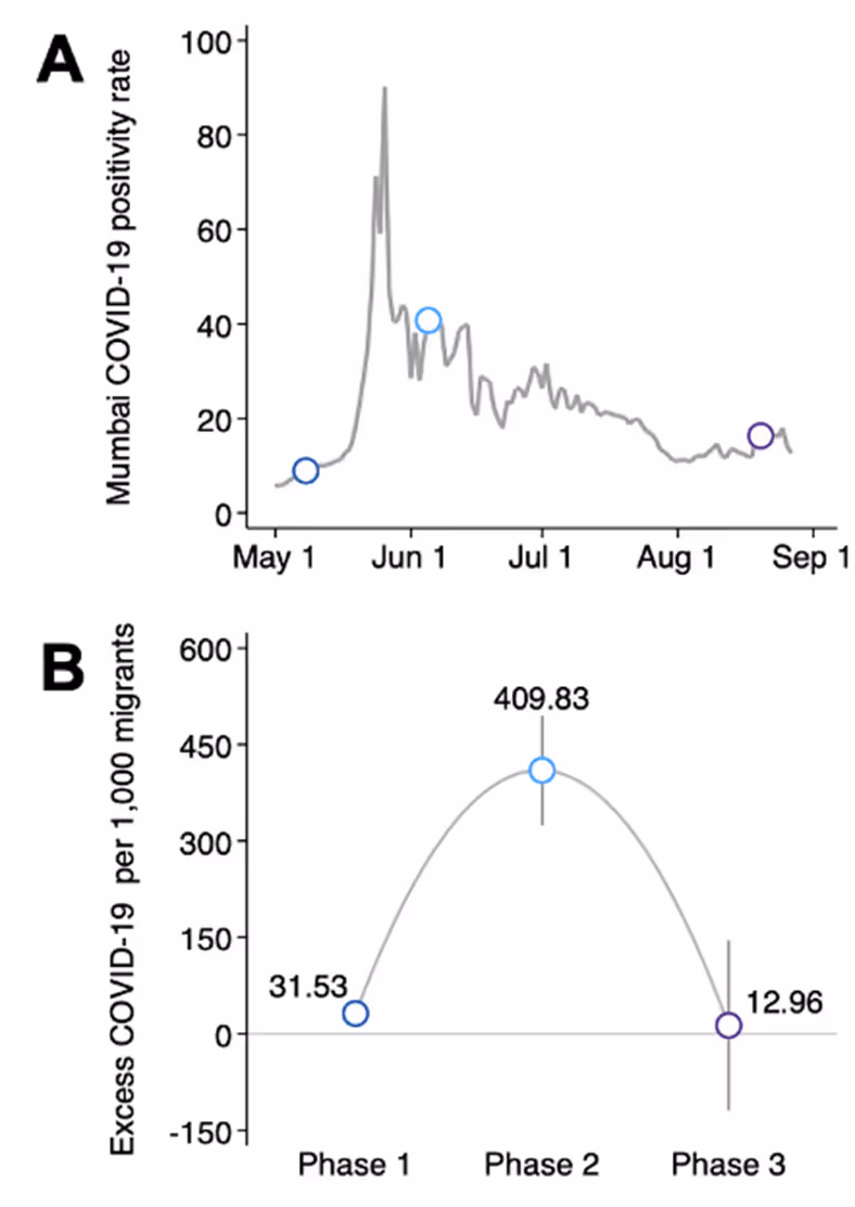 Notes: (i) Panel A shows the Mumbai’s Covid-19 case positivity rate ‘time series’ (moving average of prior seven days). (ii) Dots mark the Phase 1 (dark blue), Phase 2 (light blue), and Phase 3 (purple) release dates. (iii) Panel B shows regression estimates of excess Covid-19 cases per 1,000 Mumbai migrants in Phase 1, Phase 2, and Phase 3 districts 30 days after travel ban releases. (ii) A confidence interval is a way of expressing uncertainty about estimated effects. A 90% confidence interval, means that if you were to repeat the experiment over and over with new samples, 90% of the time the calculated confidence interval would contain the true effect. 90% confidence intervals are shown in grey vertical bars.