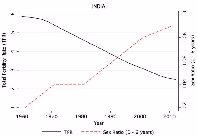 Figure 1. Trends in total fertility rate and child sex ratio in India