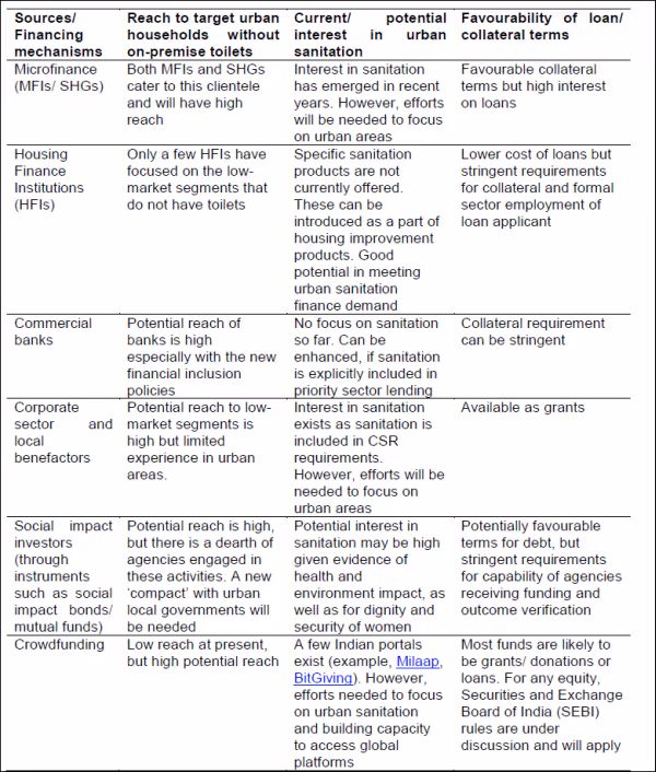 Commercial banks: Possibly, the largest source of funding for sanitation can come from commercial banks which can provide loans to households and SHGs. For increasing their reach, sanitation loans should be included explicitly under priority sector lending. The new financial inclusion scheme, Pradhan Mantri Jan Dhan Yojana, that entitles every family to have a bank account, can make it easier to reach the right groups for sanitation loans.
