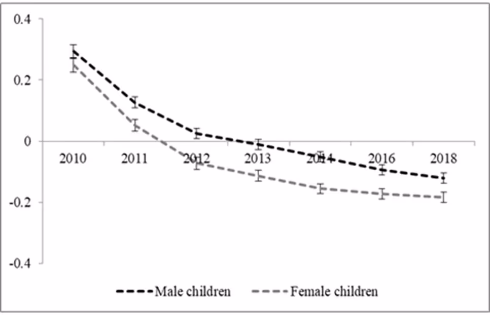 वर्ष 2010 से 2018 तक के लिए विभिन्न आयु-वर्गों में मापा गया हमारा कालगत विश्लेषण बताता है कि कुल मिलाकर, गणित में लड़कियों और लड़कों दोनों के प्रदर्शन में गिरावट आई है और महिलाओं के लिए यह प्रतिकूल स्थिति समय के साथ जारी है (चित्र 1)। वास्तव में, हमें समय के साथ इस अंतर के कम होने का (समरूपता का) कोई प्रमाण नहीं मिलता है। तथापि, हमारे आंकड़ों के अनुसार हाल के वर्षों (2018) में पढ़ने के परीक्षणों में लड़कियों ने लड़कों की तुलना में बेहतर प्रदर्शन किया है।