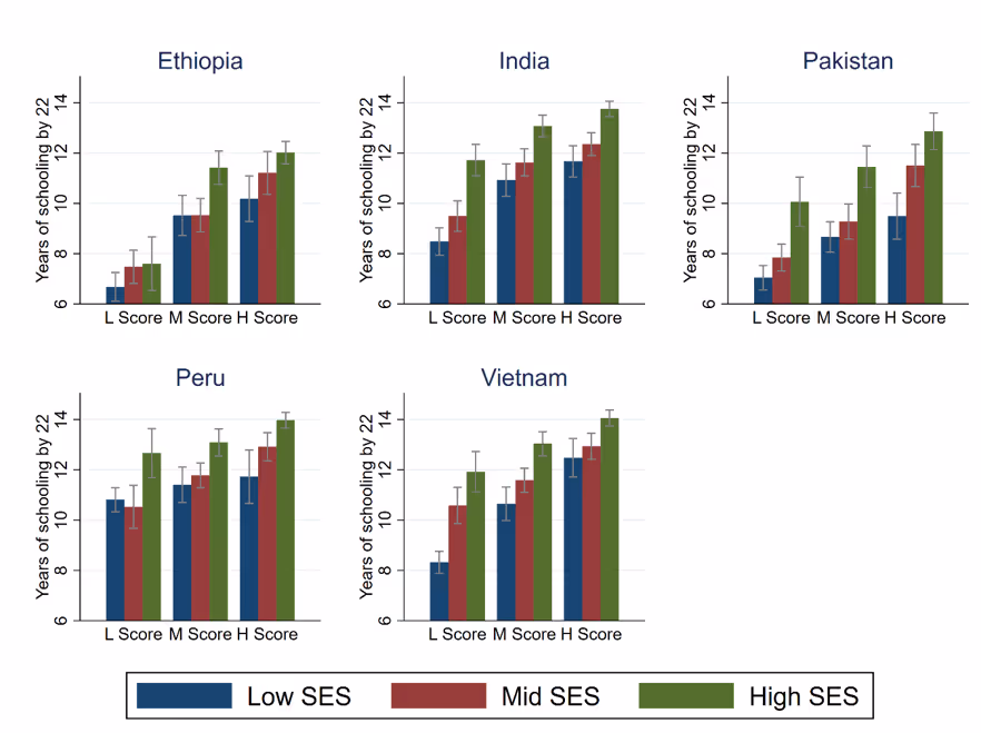 Figure 1 is a snapshot of how years of schooling at age 22, differ by SES, and test scores at age 12, in the five countries in our study. The good news is that the data confirms the dramatic improvements in average years of schooling over the last two decades: even in the poorest third of the sample, most individuals receive 8-10 years of schooling. It also confirms that achievement in primary schooling is important: in every SES group, higher test scores at age 12 correlate with more completed schooling at age 22.