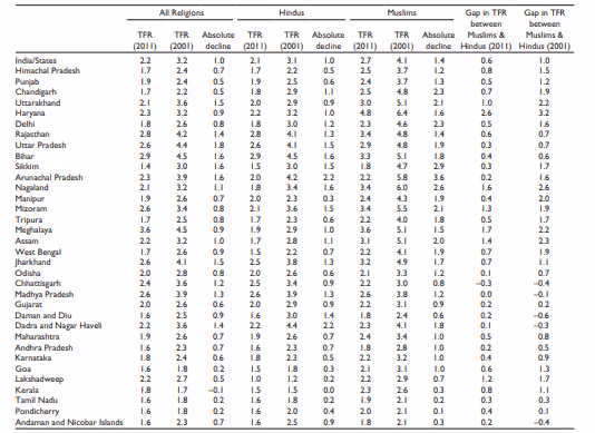 Table 1. Estimates of TFR for all religions, Hindus, and Muslims across states (excluding Jammu & Kashmir) from Census 2011, and comparison with Census 2001 estimates