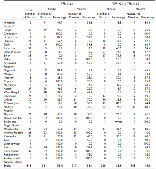 Table 2. Percentages of districts falling under different levels of fertility for Hindus and Muslims for all states in India (excluding Jammu & Kashmir)