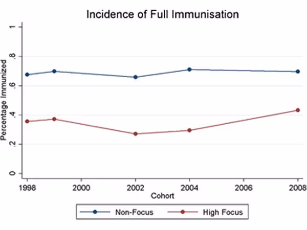 As a result, when the District Level Household and Facility Survey (DLHS) collected data from a representative sample of villages in 2008, 74% of the villages from high-focus states had an ASHA as opposed to 33% in non-focus states. By 2008, 4.6 ASHAs per health sub-centre had completed the first round of training in high-focus states whereas this figure was 1.6 in non-focus states. These differences in the presence of ASHAs, between high & non-focus states, is clearly a fall-out of government policy and my analysis makes use of this variation to present preliminary estimates of the impact of the programme on childhood immunisation.
