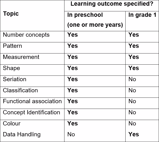 Several domains that are key to children’s early numeracy acquisition are addressed only at the preschool stage. Their absence in the first grade learning outcome specifications suggests that children are expected to have acquired these skills prior to entering primary school. This assumption is not supported by data on children’s learning.