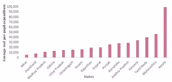 More importantly, we calculate the real per-pupil expenditure (RPPE) on education across states, using state-level CPI (consumer price index) data, available from 2010-11 to 2015-16 from the Ministry of Statistics and Programme Implementation. We deflate the nominal expenditure on education to get the real expenditures (base year 2010) and divide by the state-level enrolment in government primary schools available from DISE (District Information System for Education) state report cards 2010-2015. The average RPPE over the six-year period demonstrates considerable variation across states as shown in Figure 2: The figure for Kerala is more than 17 times that of Bihar.