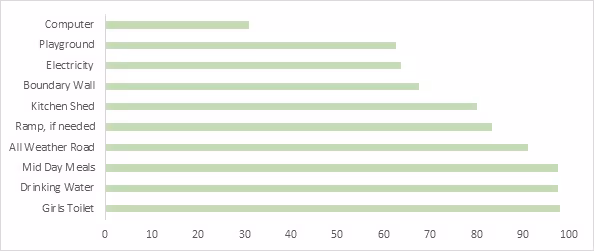 Next we investigate school infrastructure as a possible determinant of learning outcomes. Figure 6 shows the nation-wide performance of schools in 2016 in terms of several key amenities, with state populations used as weights, using data from DISE state report cards. The data show mixed results with facilities like girls’ toilets, mid-day meals, and drinking water reaching near-universal levels, but a large scope for improvement in some of the others. More than a third of the schools still lack access to electricity and less than a third have access to a computer. Similarly, more than a third of the schools do not have a playground or boundary walls. Additionally, these national-level statistics mask wide differences across states.