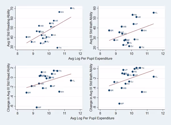 What is crucial, though, is whether higher RPPE translates into better learning outcomes. From Figure 4, it seems certainly the case. We find that for grade 3 students (same trend holds for grade 5) the average mathematics- and reading ability scores show a positive correlation with average RPPE over 2010-2014. The positive correlation also holds if we look at average changes in learning outcomes. It suggests that higher the RPPE on education in a state, the better the prospects for the state to improve its student learning outcomes.