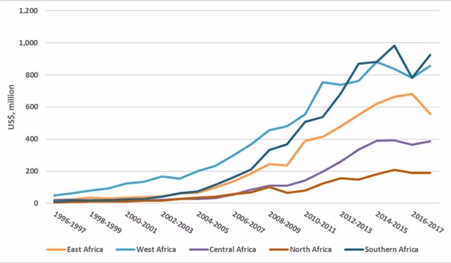 The southern and western regions of Africa are the largest importers of Indian pharmaceuticals (Figure 1). These two regions also have the largest number of people living with HIV/AIDS worldwide. India’s expertise in producing generic drugs that sell at one-fourth of their previous prices has been a big and beneficial component of the trade partnership with Africa. For example, in early 2001, when only one in 1,000 HIV-positive Africans had access to lifesaving anti-retroviral (ARV) medicines – critical for controlling and preventing the transmission of HIV/AIDS – the Indian generic pharmaceutical firm Cipla Ltd offered to sell the triple combination of ARV treatment for US$350 per person per year. This was at a time when ARV drugs were being sold by big pharma in developed economies for US$10,000-15,000 – unaffordable for patients in developing countries. More recently, in 2017, two Indian generic pharmaceutical companies, Mylan and Aurobindo, disrupted the market by marketing the generic ARV at $75 per patient a year, which will be supplied in 92 countries, most of them in Africa.