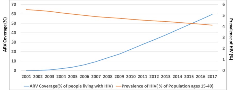 There is a strong correlation between the decline in HIV/AIDS prevalence and the increase in ARV coverage. Between 2001 and 2017, in sub-Saharan Africa, the prevalence of HIV declined from 5.1% to 4% (Figure 2). In 2017, 60% of people living with HIV/AIDS in the African region were receiving ARV treatment. This is a significant achievement, and moves the continent towards the 90-90-90 targets of the Joint United Nations Programme on HIV/AIDS (UNAIDS) that aim to “diagnose 90 percent of all HIV-positive persons, provide ARV drugs for 90 percent of those diagnosed, and achieve viral suppression for 90 percent of those treated by 2020.”