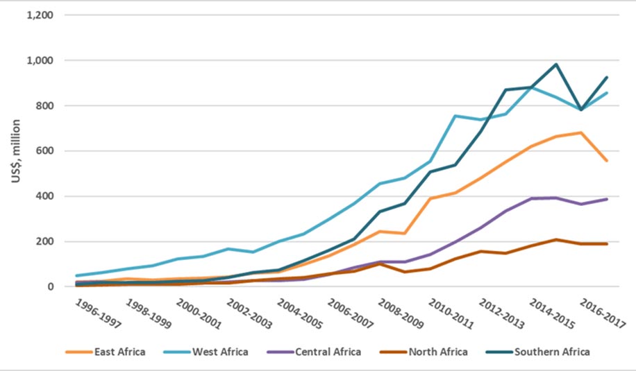 The southern and western regions of Africa are the largest importers of Indian pharmaceuticals (Figure 1). These two regions also have the largest number of people living with HIV/AIDS worldwide. India’s expertise in producing generic drugs that sell at one-fourth of their previous prices has been a big and beneficial component of the trade partnership with Africa. For example, in early 2001, when only one in 1,000 HIV-positive Africans had access to lifesaving anti-retroviral (ARV) medicines – critical for controlling and preventing the transmission of HIV/AIDS – the Indian generic pharmaceutical firm Cipla Ltd offered to sell the triple combination of ARV treatment for US$350 per person per year. This was at a time when ARV drugs were being sold by big pharma in developed economies for US$10,000-15,000 – unaffordable for patients in developing countries. More recently, in 2017, two Indian generic pharmaceutical companies, Mylan and Aurobindo, disrupted the market by marketing the generic ARV at $75 per patient a year, which will be supplied in 92 countries, most of them in Africa.