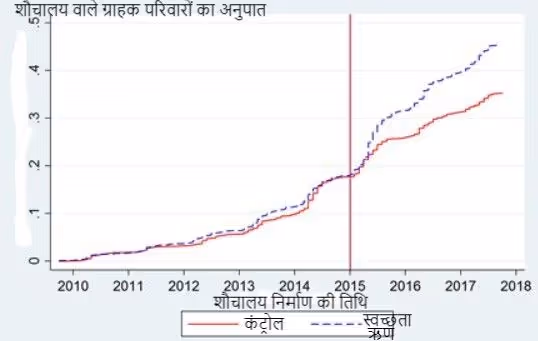 पहले जैसे कहा गया है कि ऋण लिया जाना अपने आप में यह बताने के लिए अपर्याप्त प्रमाण है कि स्वच्छता संबंधी निवेशों में वृद्धि हुई है। इसलिए हमने शौचालयों के स्वामित्व पर, और मौजूद शौचालयों की मरम्मत और अपग्रेड करने पर हस्तक्षेप संबंधी प्रभावों का विश्लेषण किया। हमने पाया कि स्वच्छता संबंधी सूक्ष्मऋण के हस्तक्षेप से शौचालयों के अपटेक में लगभग 9 प्रतिशत अंकों की वृद्धि हुई, जिसे आकृति 2 में देखा जा सकता है। गौरतलब है कि आंकड़े कंट्रोल ग्राम पंचायतों में भी (जहां हस्तक्षेप नहीं किया गया था), खास कर 2014 के मध्य में शौचालयों के अपटेक में तेज वृद्धि दर्शाते हैं। इसका कारण संभवतः स्वच्छ भारत मिशन कार्यक्रम है जिसकी शुरुआत 2 अक्तूबर 2014 को की गई थी। ट्रीटमेंट वाले ग्राम पंचायतों में (जहां हस्तक्षेप किया गया) पाए गए प्रभाव इस वृद्धि के अतिरिक्त हैं।