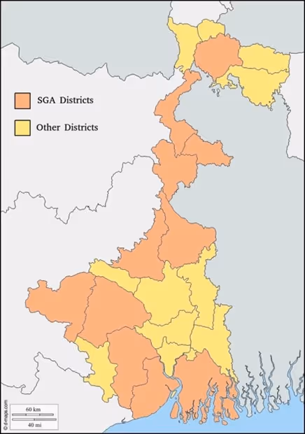 पश्चिम बंगाल सरकार ने वर्ष 2012 में अपने कुल 19 जिलों में से 11 (तत्कालीन) 'पिछड़े' जिलों में पूर्ण घरेलू विद्युतीकरण लाने के लिए एसजीए की शुरुआत की (आकृति-1)। पिछड़ा क्षेत्र अनुदान निधि के तहत एक बड़े परिव्यय द्वारा वित्तपोषित इस योजना का लक्ष्य इन जिलों में गरीबी रेखा से नीचे के बीस लाख से अधिक परिवार थे। क्रियान्वयन में वितरण अवसंरचना को मज़बूत करना शामिल था ताकि वंचित ग्रामीण इलाकों को बिजली का नियमित कनेक्शन मिल सके।