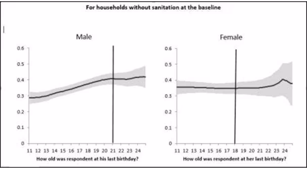 हमारे विश्लेषण से यह पता चलता है कि विवाह-योग्य उम्र के लड़कों वाले परिवारों में, विवाह-योग्य उम्र की लड़कियों वाले परिवारों की तुलना में शौचालय में निवेश करने की औसतन 10 प्रतिशत अधिक संभावना है– इसे एक स्पष्ट संकेत के रूप में माना जा सकता है कि शौचालय में निवेश करने से विवाह बाजार के परिणामों में सुधार होता है।