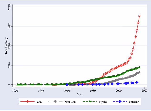 Our primary interest is to understand the detrimental effects of coal-fired power generation and the associated air pollution, in terms of the incidence of anaemia. We leverage the spatial variation in the presence of coal units at a point in time and the change in the number of coal units over a specific period to examine the effects of coal-induced pollution on the anaemic status of children and women. Over the last three decades, India has experienced rapid economic growth, which has contributed to a substantial increase in electricity demand, which has increased by 150%: from 388 terra watt hours (TWh) in 2001 to 989 TWh in 2015 (Ali 2018). The country has primarily built coal-fired power units to meet this demand. The data on power units and capacity obtained from the Central Electricity Authority of India (CEA), provide the year of commissioning of all units generating power (from 1922-2016), the main source of fuel for these units (coal, non-coal (diesel and oil), hydro, and nuclear), the capacity of each unit, and the district of location of each unit. Figure 2 shows that while total capacity from hydro and non-coal powered units has exhibited a modest increase over the period from the year 2000 onwards, total capacity generated from coal-powered units has increased exponentially, especially in the last 10 years.