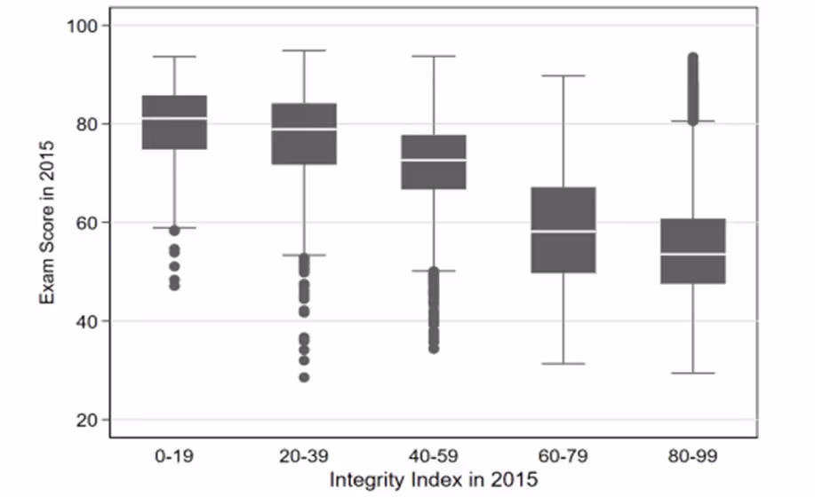 The Indonesian government also disseminated an ‘integrity index’ at the school level by identifying cheating through suspicious answer patterns. Figure 4 plots the integrity index against exam scores, showing that the lower the integrity, the higher the exam scores, while also indicating a high variance in the exam scores of schools with high integrity.