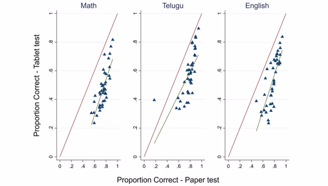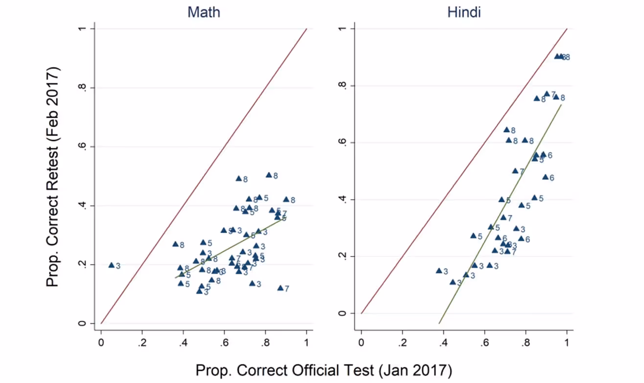 Note: If the proportion of correct answers in the official and independent tests was similar, all the dots would be along the red line, instead we see that the proportion answering correctly in the official test are much higher in both math and Hindi.