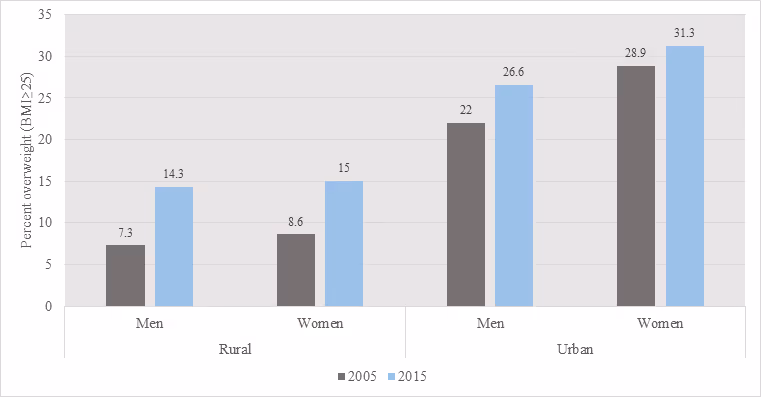 राष्ट्रीय परिवार स्वास्थ्य सर्वेक्षण (एनएफएचएस) 2015-16 के आंकड़ों के अनुसार भारत की लगभग 20% जनसंख्या मोटापे से ग्रस्त है। यह लेख बताता है कि देश में मोटापे की प्रवृत्ति ने इसके स्वाभाविक आर्थिक परिवर्तन का ही अनुसरण किया है जिसके अंतर्गत शहरीकरण में वृद्धि ग्रामीण विकास को प्रभावित करती है। इससे ज्ञात होता है कि शहर के आसपास के गांवों पर पड़ने वाले शहरीकरण के प्रभाव का दायरा जब एक किलोमीटर बढ़ता है तो लगभग 3,000 ग्रामीण महिलाओं में मोटापे में वृद्धि होती है।