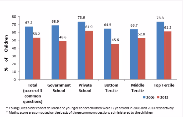Young Lives collects cognitive achievement scores for children in each round. This survey has highlighted a decline in mathematics test scores6 amongst children aged 12 in 2013, as compared to children of the same age in 2006. Mathematics tests scores for the same questions administered to children in the two rounds revealed that while 67% of the children in 2006 answered the questions correctly; this number fell to 53% in 2013 – a decline of 14 percentage points (Figure 2). This decline is seen across government and private schools as well as all the wealth terciles. The most severe decline is noticed in government schools (20 percentage points) and surprisingly even the children in private schools and the wealthiest terciles show a decline of 12 percentage points each.
