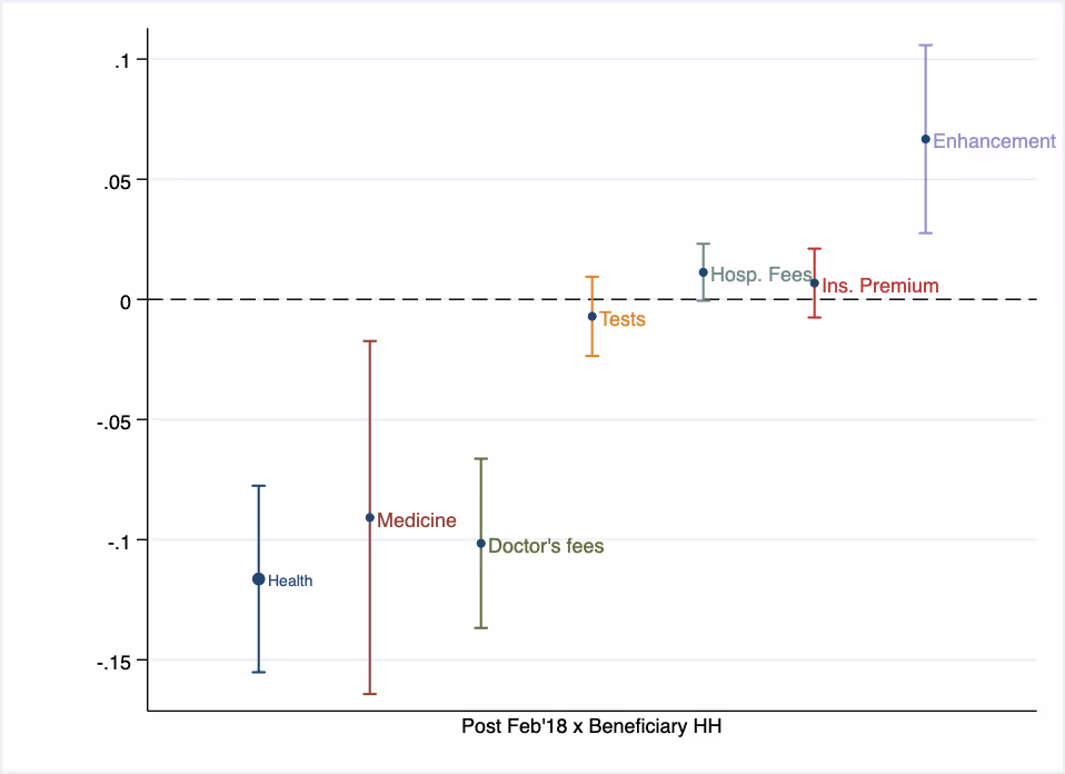 हमारे निष्कर्षों से पता चलता है कि ईपीएफ कटौती के बाद गैर-लाभार्थियों की तुलना में लाभार्थी परिवारों के कुल स्वास्थ्य व्यय में 11.6% की गिरावट आई है। दूसरे शब्दों में कहें तो, हम अतिरिक्त आय प्राप्त करने वाले परिवारों द्वारा ऐसे परिवारों की तुलना में स्वास्थ्य देखभाल पर मासिक व्यय में कमी पाते हैं, जिन्हें आय लाभ नहीं मिला। आकृति -1 में सम्पूर्ण स्वास्थ्य देखभाल और स्वास्थ्य व्यय की विभिन्न श्रेणियों के गुणांक अनुमान को रेखांकन द्वारा दर्शाया गया है।