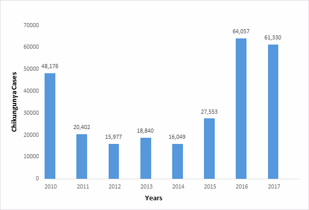 Since 2007, diagnosis and data assimilation for CHIK in India has been facilitated by the National Vector Borne Disease Control Programme (NVBDCP). The programme has 347 sentinel centres in 35 states, and 14 apex referral laboratories. Based on NVBDCP data, the number of CHIK cases reported during 2010-2017 is presented in Figure 1.