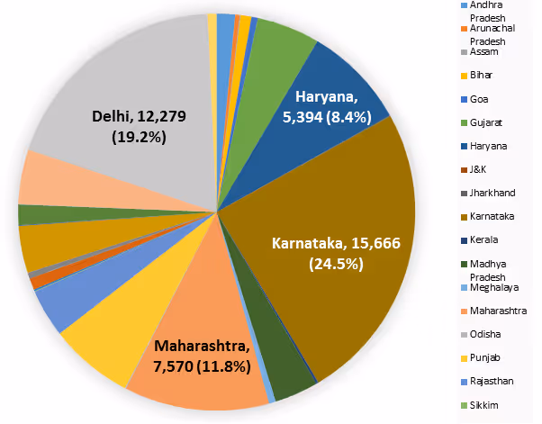 In 2016 there were 64,057 cases of CHIK. From Figure 2 below, it is evident that the major share of CHIK cases are from Karnataka, accounting for 24.5% of the total number of cases. This is followed by Delhi (19.2%), Maharashtra (11.8%), and Haryana (8.4%). Therefore, these four states together account for nearly 64% of all cases.