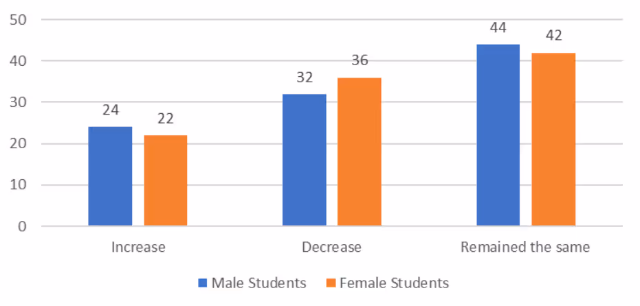 We found that about 41% of boys do not contribute to household work at all, and about 48% spend only 1-2 hours in such work. On the other hand, over 54% of girls spend at least 1-2 hours and 36% spend 3-4 hours on unpaid domestic work. Over 5% of girls spend more than five hours on such work. However, since the pandemic, male participants’ time spent on unpaid work such as cooking, cleaning, and childcare had increased at higher rates comparable to their female counterparts (see figure 2).