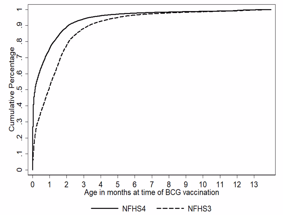 हम बीसीजी और डीपीटी-3/पेंटावैलेंट-3 टीके लगवाये गए शिशुओं के संचयी प्रतिशत को दर्शाते हैं क्योंकि वे नीचे चित्र 3 और 4 में बड़े हो जाते हैं।