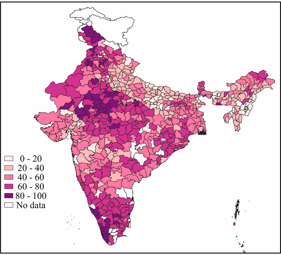 हम पांच साल से कम उम्र के बच्चों के टीकाकरण में औसत जिला स्तर की समयबद्धता का अध्ययन करने के लिए एनएफएचएस-4 (2015-16) डेटा का उपयोग करते हैं। हम समयबद्धता के स्थानिक वितरण को स्पष्ट करने के लिए बीसीजी और डीपीटी-3/पेंटावैलेंट-35 टीकों के आंकड़े प्रस्तुत करते हैं।