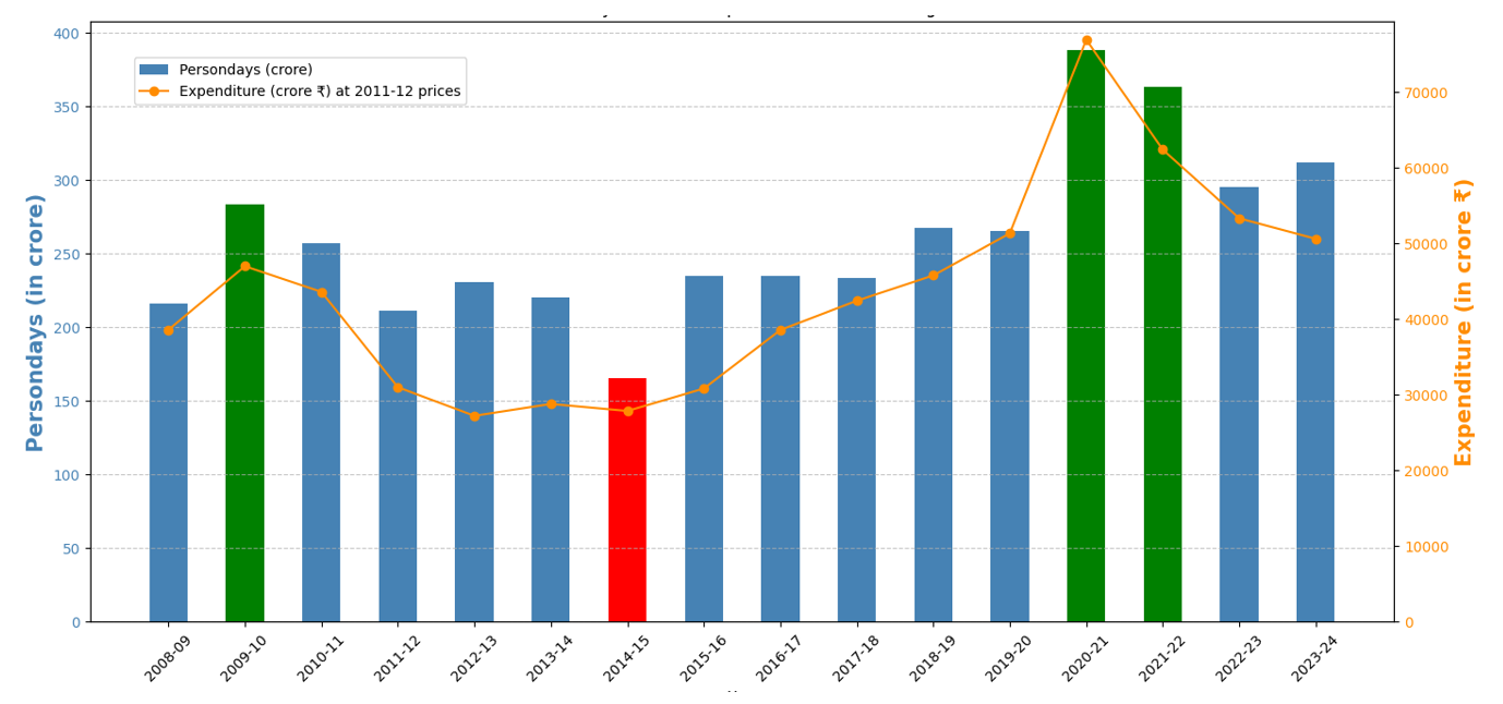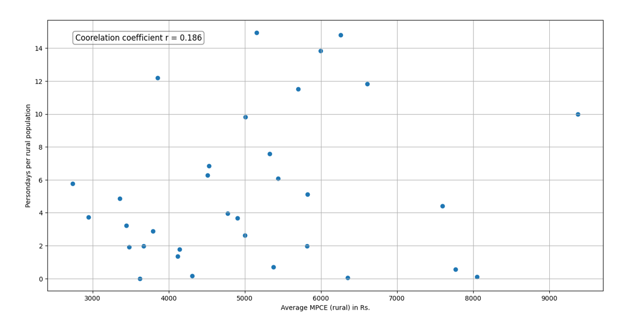Sources: MNREGA-MIS, Report R7.1.2, for person-days; Government of India (2020) for projected population; National Statistics Office (2025), Statement 7 for MPCE estimates.