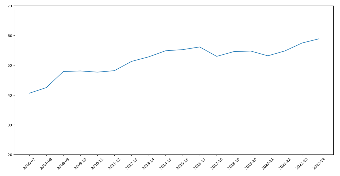 Figure 6. Women’s share of MNREGA person-days, 2011-12 and 2023-24 (%)