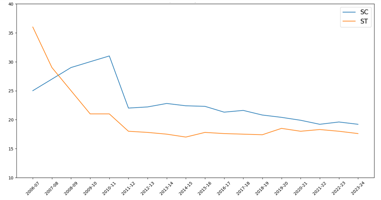 Figure 7. Shares of Scheduled Castes and Scheduled Tribes in MNREGA person-days (%)