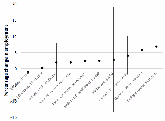 A final class of studies considers programmes designed to reduce information and search frictions, and to better match workers and firms together. These include public information services, job fairs, certification of hard and soft skills, and transport subsidies. These services tend to be much cheaper than training or wage subsidies, costing US$25 or less per person assisted.