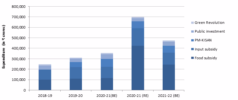 Note: Gulati and Banerjee (2020) classification. “Green Revolution” consists of several small development schemes mentioned in Union Budget 2021-22. Input subsidy includes subsidies on fertiliser, crop insurance, and interest subsidy on short-term credit. Public investment’s components are elaborated in Figure 8.