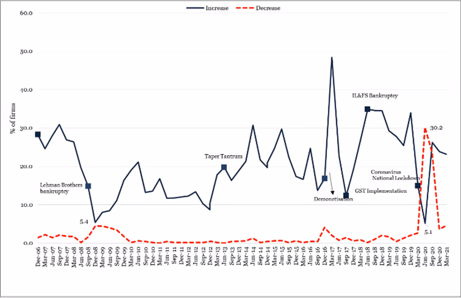 Notes: (i) Increase means that firms responded that number of employed workers increased in the last three months. Decrease means the reverse. A third option is unchanged, which is not shown in the graph for simplicity purposes. (ii) The months-years indicate when the surveys were carried out.