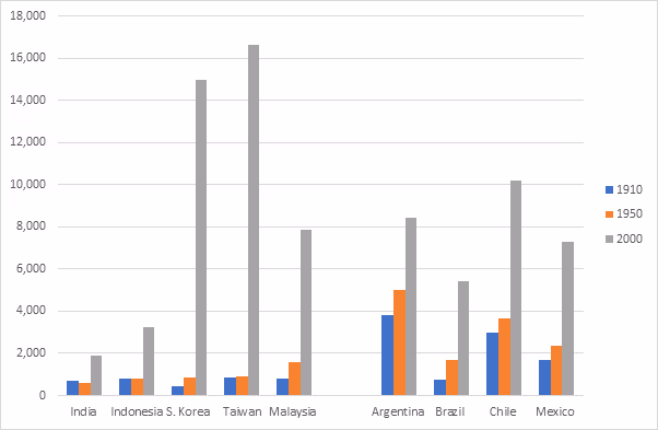 South Korea and Taiwan emerged from Japanese colonisation in the middle of the 20th century and moved to a high-growth regime. These economies did not look significantly different from India in 1910 in terms of per capita GDP. But Japan as a coloniser, adopted different policies. As exporters of rice to Japan, Korea and Taiwan adopted Japanese varieties of rice for cultivation. This went with improvements in the infrastructure for rice cultivation. Over 80% of land under cultivation was irrigated in Taiwan and 68% in Korea by 1939 (Booth 2007). Agricultural productivity increased during Japanese rule. Per capita GDP also increased in both countries from 1910. Where the East Asian countries differed from India was not in industry, but in agriculture and human capital.