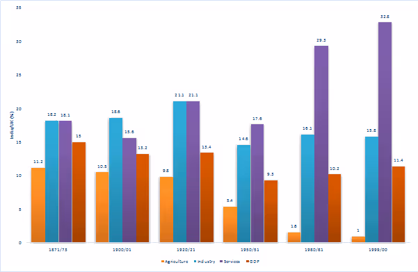 Colonisation left a deep imprint on the development of the post-colonial decades. In 1980, there were systematic differences in agricultural productivity between landlord and non-landlord regions of colonial India (Banerjee and Iyer 2005). The effect of regional variation in education spending in 1911 was visible until 1971 (Chaudhary and Garg 2015). Western India had an advantage over the East. High share of secondary and tertiary education in education spending also remained a feature of the education system with implications for human capital of the workforce. This was an advantage to the service sector and may explain the high productivity in the sector. The 2001 Census shows a concentration of workers with secondary and tertiary education in services. Agriculture had the largest number of workers without basic education. Surprisingly, a large proportion of industrial workers also lacked primary education.