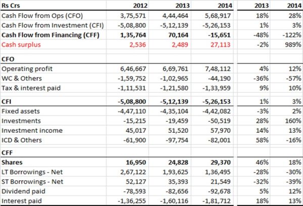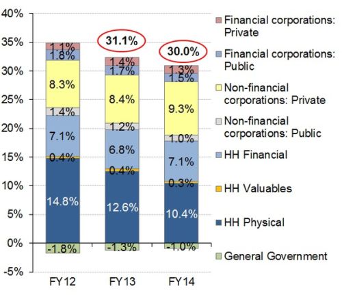 The next issue is the use of these financial savings. Remember the doubt about the compatibility of high GDP growth and low credit offtake? One hypothesis is that companies over the past few years have used their profits (internal accruals) to fund at least a part of their lower capex requirements. The sample of 4,500 companies which we have used reported a rise in Cash Flow from Operations from Rs 3.75 trillion in FY12 to Rs 5.69 trn in FY14 (Table 1). In turn, investment in fixed assets remained stable at around Rs 4.4 trn during all three years. At the same time, long- and short-term borrowings (from banks and other intermediaries) have fallen from about Rs 3.2 trillion in FY12 to about Rs 1.6 trn in FY14), highlighting both the slowing demand for funds for additional capex and the falling reliance on external credit sources.