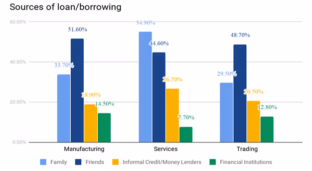 If we look at credit, 40% of the respondents tried to take a loan, and 85% of those who tried, were successful in securing the same. There were some variations across sectors (Figure 6). However, most of the loans secured by business owners were through informal sources – 58% of all respondents who secured loans, received it from friends, while 34% received it from family members. Only 14% of the overall borrowing was from formal sources – predominantly microfinance institutions.