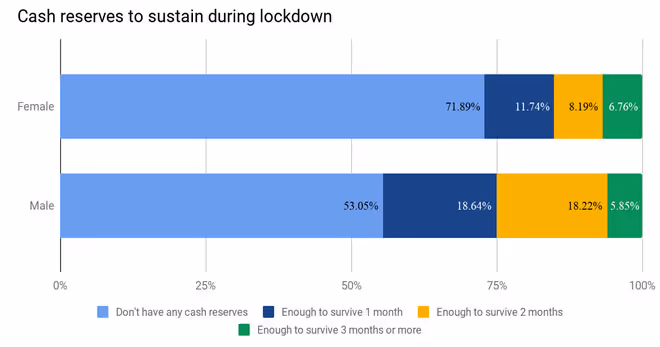 During the lockdown, 57% of businesses reported that they do not have any cash reserves to survive. Businesses also dipped into savings to meet expenses, with the median value of Rs. 30,000 wiped out from savings. Female-led microenterprises seem more vulnerable than male-led businesses. While 53% of male business owners suggested lack of any sort of cash reserves, the figure shot up to 72% for female-led businesses.