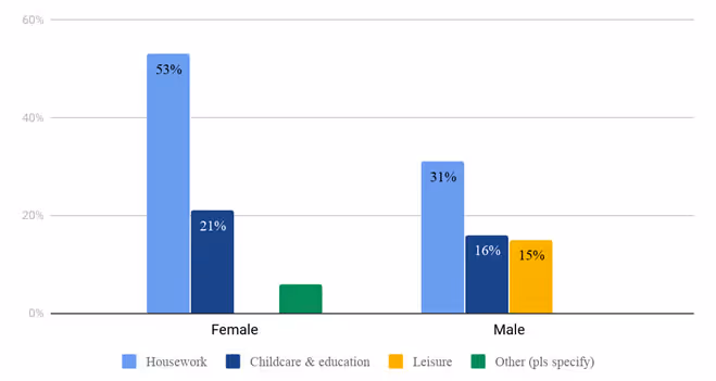 There are also major differences when it comes to household tasks that male and female members of the household performed during lockdown (Figure 11). While 53% of female respondents suggested that household chores were a priority for them during lockdown, only 31% male respondents reported so. At the same time, 15% males listed leisure activities as one of the priority tasks during lockdown, while none of the female respondents suggested the same for themselves.