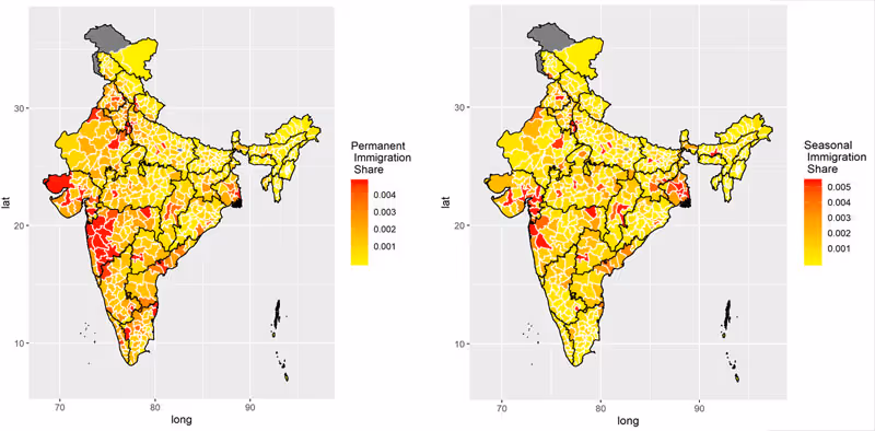 The two maps in Figure 2 paint relatively similar pictures. Permanent migrants who return will come from the main urban centres of India (for example, Ahmedabad, Bangalore, Chennai, Delhi, Mumbai), as well as from manufacturing clusters (such as in Gujarat and Maharashtra). Seasonal migrants are even more concentrated geographically, which reflects the fact that they tend to go and look for work in construction in the largest urban centres (Imbert and Papp, forthcoming).