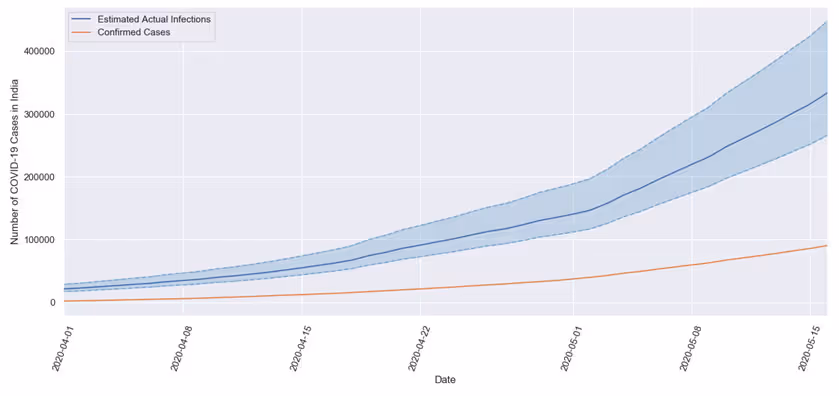 Figure 2. Estimated number of Covid-19 cases in India vs. total confirmed cases
